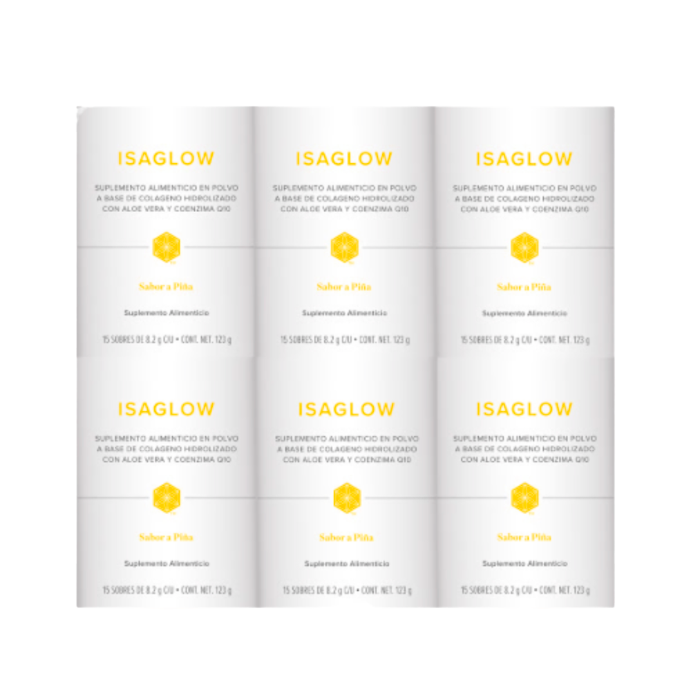 Descubre el delicioso y nuevo sabor de Isaglow! Con todos los beneficios del colágeno hidrolizado sabor piña, una forma refrescante de cuidar tu piel, cabello, uñas y articulaciones. Con un sabor piña irresistible, este suplemento combina bienestar y frescura en cada porción. Ideal para quienes buscan sentirse y verse bien desde dentro, ¡con el delicioso toque de la piña natural! (6 piezas)